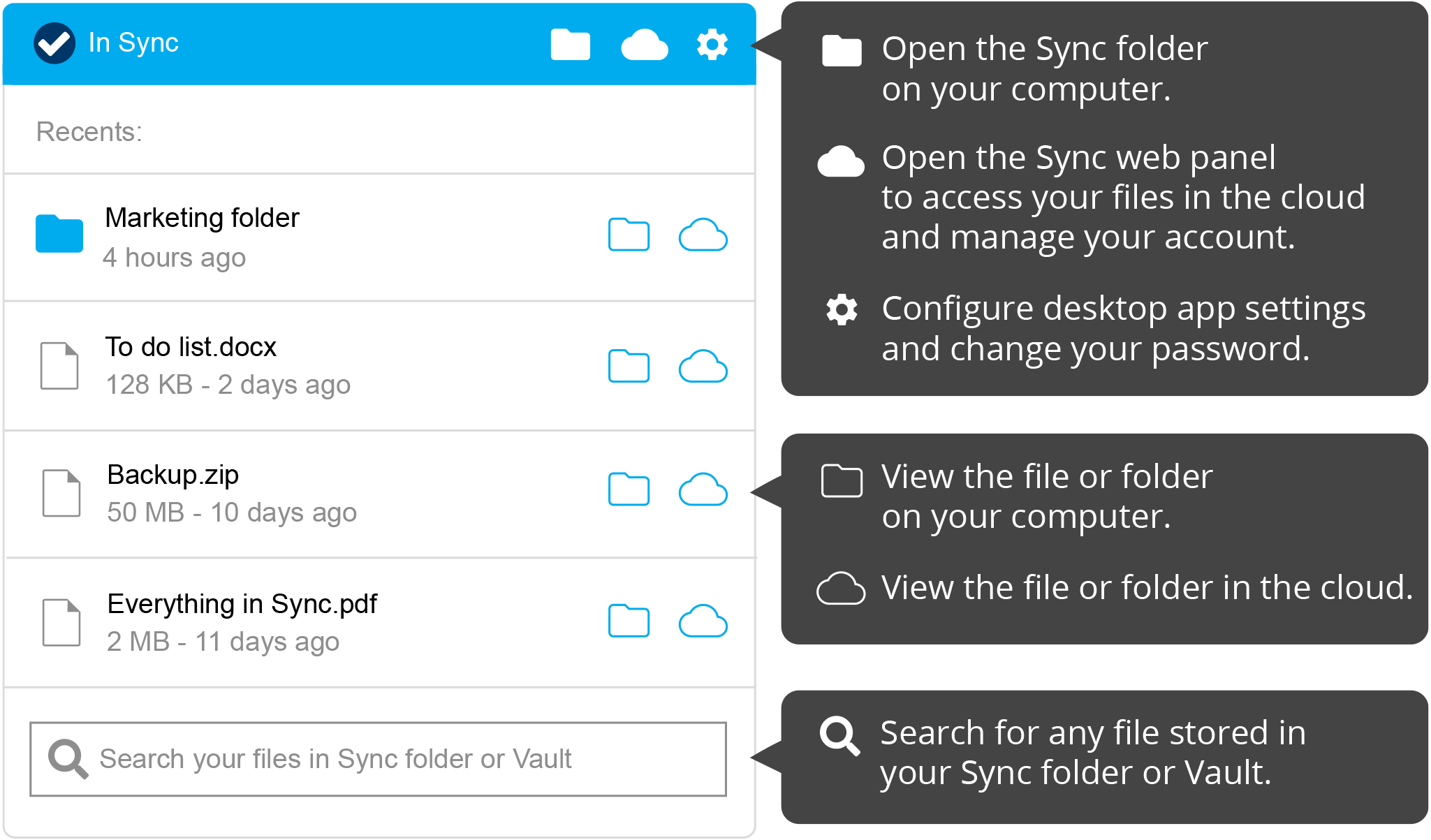 You can now use the Sync desktop app to search for any file located in your Sync folder or Vault, and to quickly access recently added or changed files. Simply click the Sync icon on your Windows system tray or Mac menu bar, and prepare to be amazed!